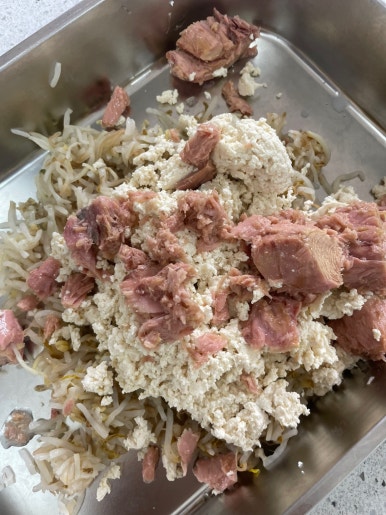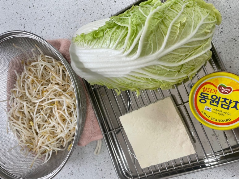 참치 한 캔을 기름을 쫙 빼고 썰어놓은 숙주, 두부와 섞어요