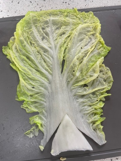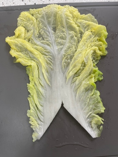 물에서 건져낸 배추를 잘 펼쳐서 가운데 줄기부분을 세모 모양으로 잘라내요