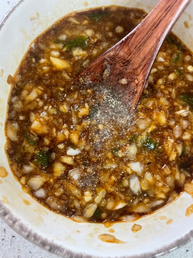 간장5T, 알룰로스3T, 후추 조금, 깨, 참기름1T를 넣고 잘 섞어주세요